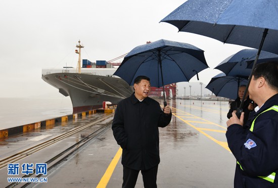 3月29日,中共中央總書記、國家主席、中央軍委主席習近平在浙江考察調研。這是習近平在寧波舟山港穿山港區碼頭了解港口復工復產情況。 新華社記者 申宏 攝