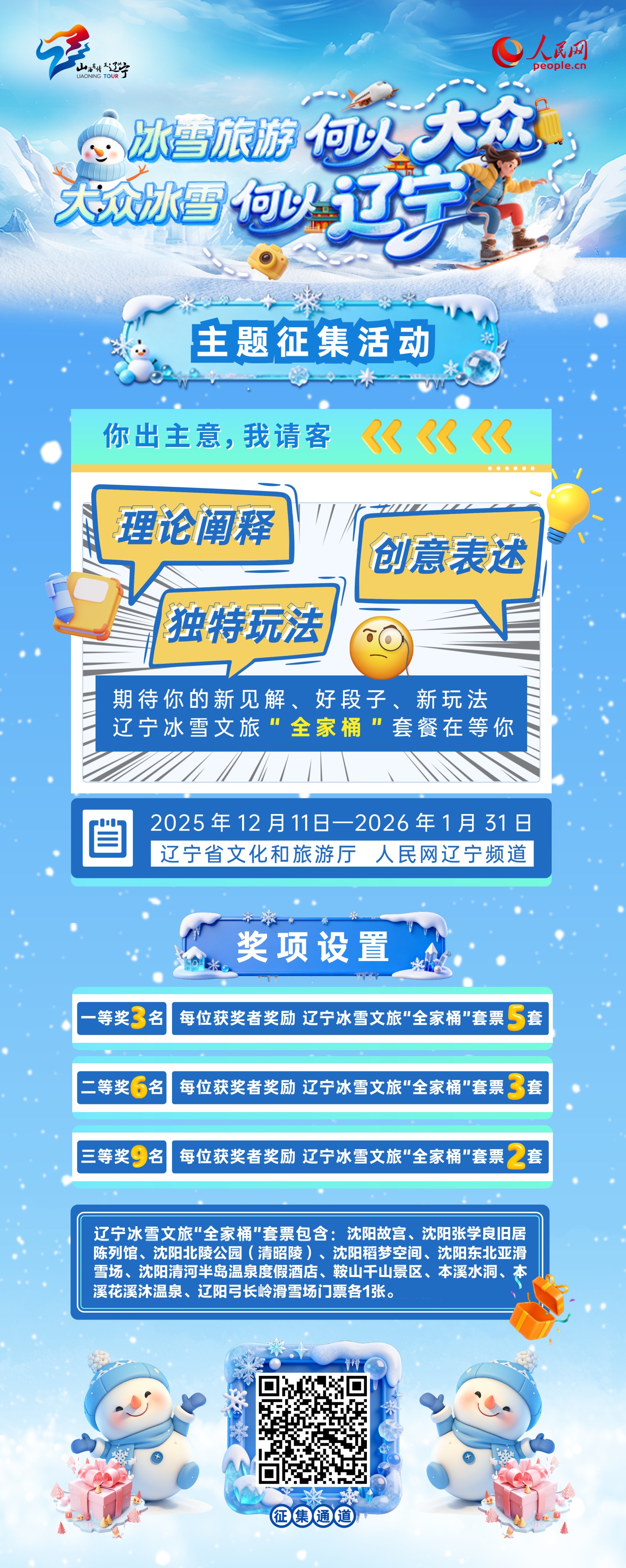 為真正讓冰雪旅游“飛入尋常百姓家”,讓大眾從“旁觀者”變為“參與者”“共創者”,遼寧省文化和旅游廳聯合人民網遼寧頻道,正式發起“冰雪旅游何以大眾,大眾冰雪何以遼寧”主題冰雪文化創意征集活動,面向全國公開征集關於遼寧冰雪文化的理論闡釋、創意表述與獨特玩法,共同解鎖屬於遼寧的冰雪密碼,打造具有全國影響力的冬季文旅新IP!